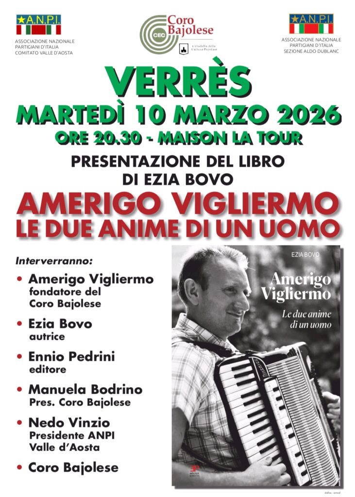 Alla serata parteciperà il Coro Bajolese che intercalerà alcuni canti della Resistenza ad altri del suo ricco repertorio durante la presentazione, alla quale interverranno: il maestro Vigliermo, l’autrice Bovo, il direttore edit. Ennio Pedrini, la Presidente del Coro Bodrino, ed il Presidente ANPI Valle d’Aosta Nedo Vinzio.