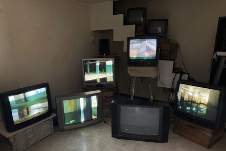 L’opera, composta da immagini proiettate su vecchi schermi a tubo catodico, rievoca la promessa di un futuro prospero, contrapponendola alla desolante realtà attuale.