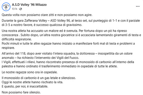 L’evento, che avrebbe potuto sfociare in una tragedia, ha visto coinvolte atlete di pallavolo a seguito di una fuga di monossido di carbonio proveniente dall’impianto di riscaldamento del palatenda comunale.