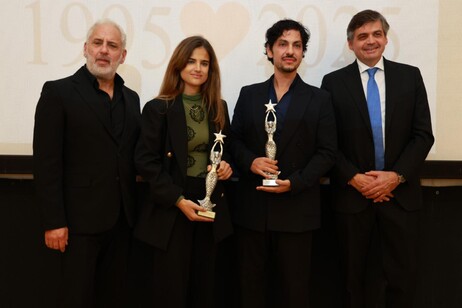 Elena Preziosi, giovane artista figlia di Alessandro e Vittoria Puccini, affiancata dalla nonna e dal fratello, consegna il prestigioso premio Person of the Year al regista e produttore partenopeo, simbolo di talento e dedizione al cinema.