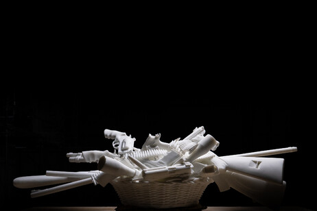 Lungi dall’abbondanza di vita e prosperità tipiche delle nature morte tradizionali, l’opera di Jago ne sovverte l’iconografia, presentando un cesto non colmo di frutti maturi, ma di armi, un’inquietante metafora del nostro tempo.