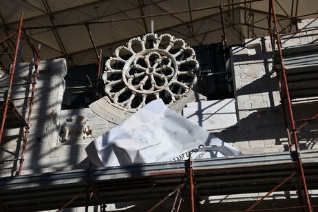 Il posizionamento definitivo sulla facciata conclude questa prima fase, ma i lavori di recupero dell’intera abbazia proseguono a ritmo sostenuto, con particolare attenzione al monastero e alla ricostruzione del campanile, elemento architettonico cruciale per il profilo dell’abbazia.