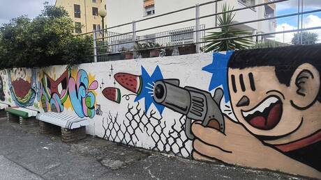 L’opera, tuttavia, è stata rimossa rapidamente, sostituendo la rappresentazione contestata con elementi simbolici di natura diversa: proiettili raffigurati come pezzi di frutta.