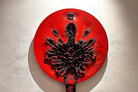 “Il silenzio dei passi perduti” è una monumentale scultura in ceramica rossa e nera, un Introrilievo che evoca un campo di battaglia devastato, martoriato da innumerevoli ferite.