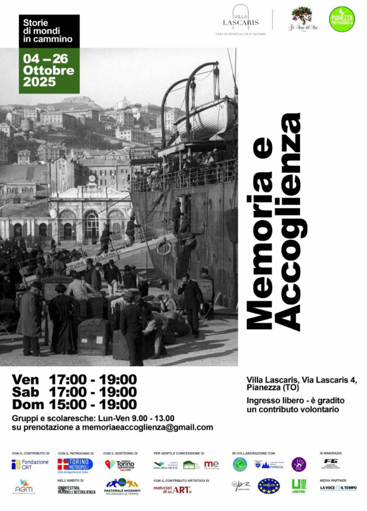 Da sabato 4 ottobre a domenica 26 ottobre 2025, Villa Lascaris a Pianezza ospita la mostra “Memoria e Accoglienza – Storie di mondi in cammino”, un percorso esperienziale e narrativo dedicato al tema delle migrazioni, promosso nell’ambito del Festival dell’Accoglienza. Allestita tra le sale storiche della residenza ottocentesca e nel suo parco, la mostra intreccia immagini, testimonianze, installazioni artistiche e video, offrendo ai visitatori un viaggio tra tempo e spazio: dai flussi migratori italiani verso le Americhe all’inizio del Novecento, passando per le migrazioni interne verso Torino durante il boom economico, fino ai movimenti contemporanei dall’Africa e dall’Asia.